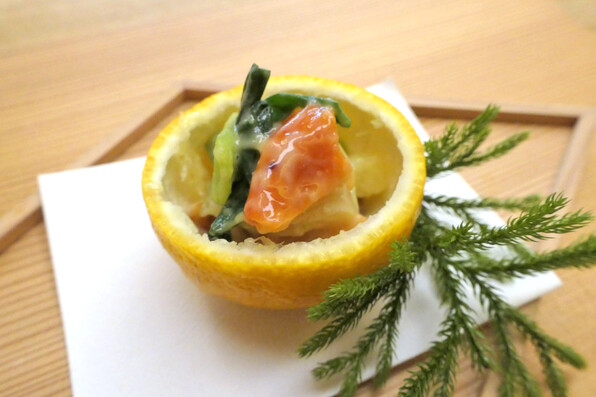●柚子釜にぬた和え。赤貝、数の子、わけぎ。