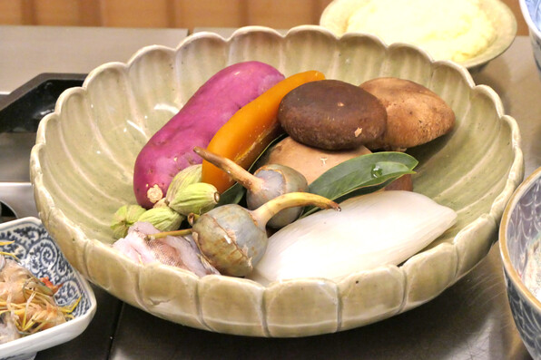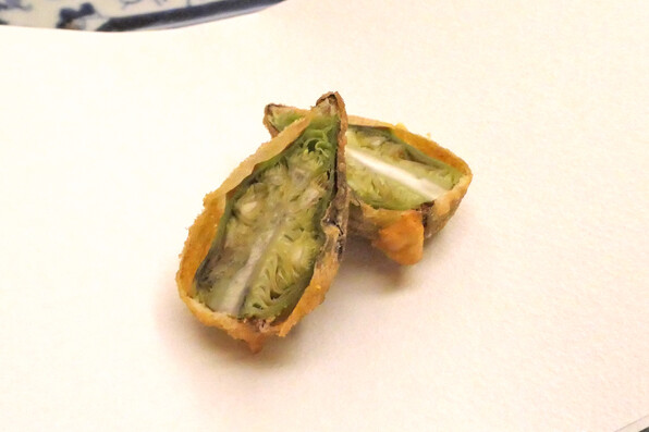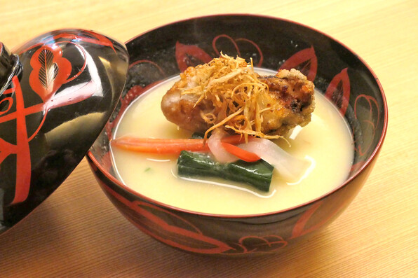 ●お椀は酒粕入りの白味噌仕立て。下から海老芋、ほうれん草、揚げた牡蠣、ささがきにして揚げた、パリパリの堀川ごぼう。