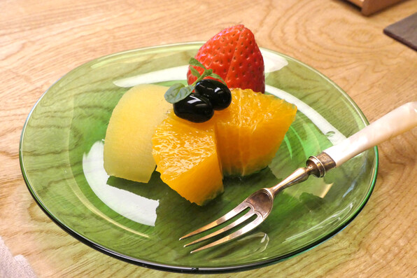 ●食後はオレンジ(紅まどんな)、りんご、いちごに、黒豆添え。