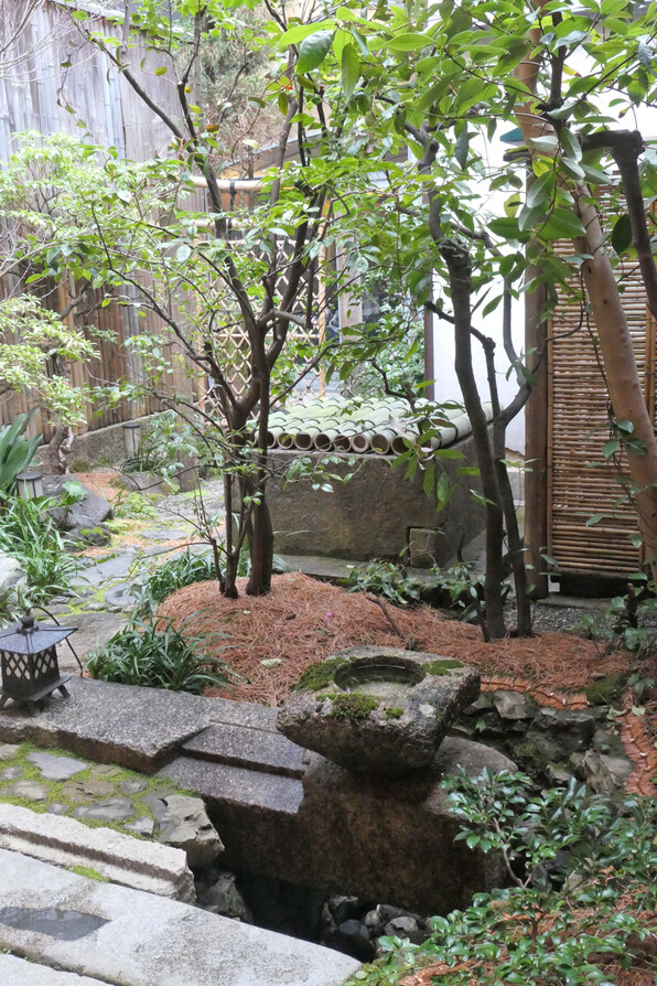 ●ガラス越しにお庭の眺め。敷き松葉も苔むした手水鉢も風雅そのものです。