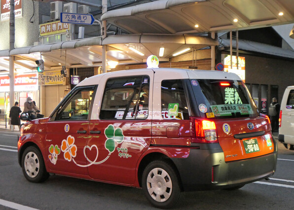 ヤサカさんタクシー車体に、三つ葉と四つ葉、間にハート。