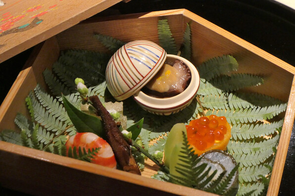 もろこ、車海老、ちしゃとう、ひらめの求肥巻き、金柑といくら、なまこ、このわたなど。