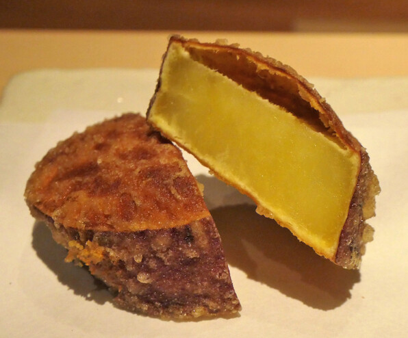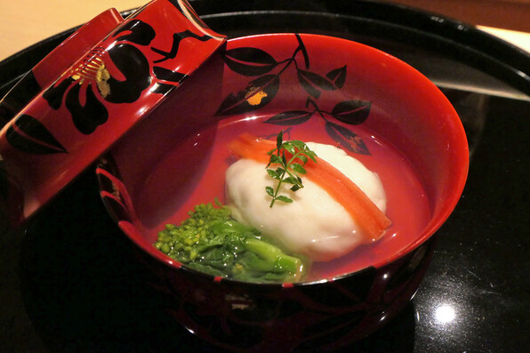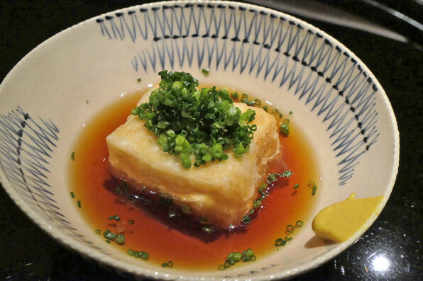 ●そしてこれがお祖父さまのスペシャリテだった、天つゆで味わう豆腐の天ぷらです。揚げだし豆腐ですまさに。お祖父さまは、「京都なら豆腐だろう」とこれを出していらして、人気のお料理だったと。