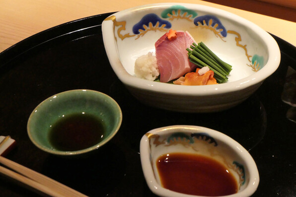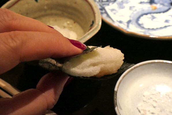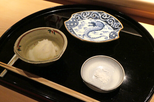 ●天ぷらのために、塩と、レモン風味の大根おろしが供されます。