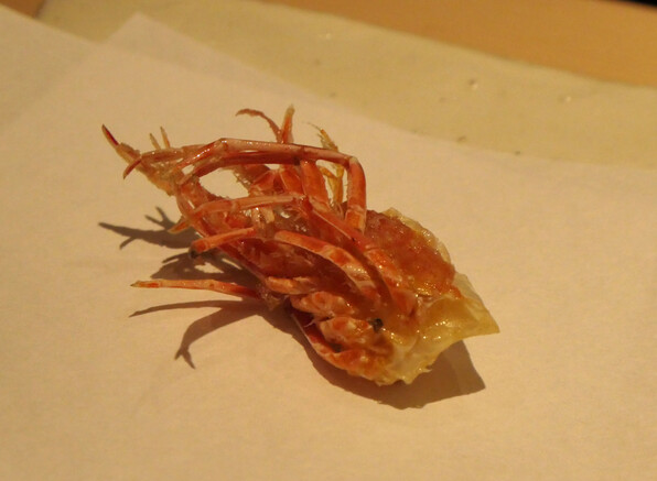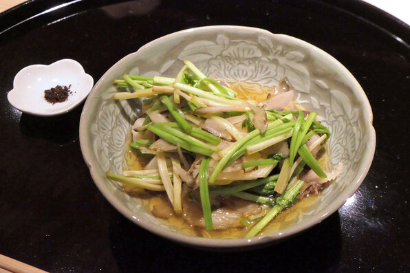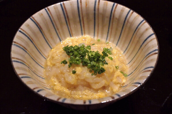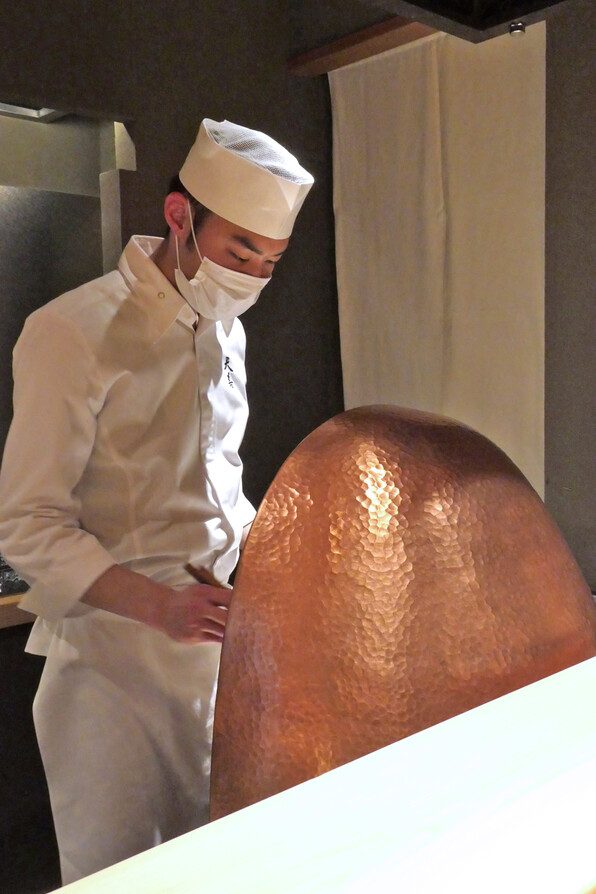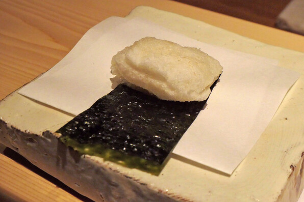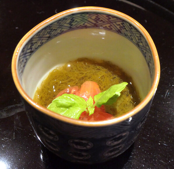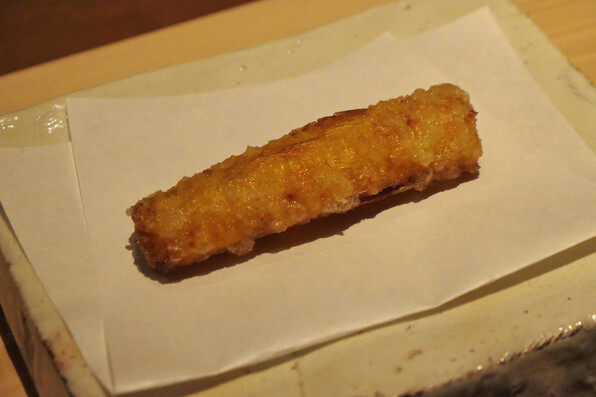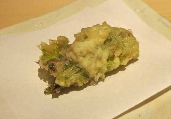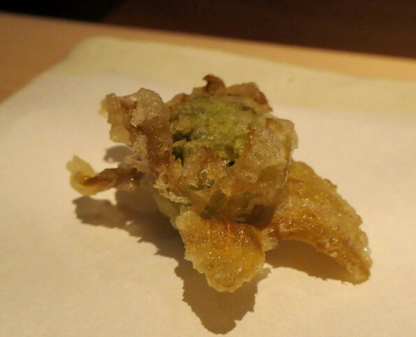 だってまず八寸が供されるから、わ、これは和久傳さん風を目指していないのだなと。八寸、お椀、お造りと出て、その後天ぷらが6品。さらに、お祖父さまもされていた、天ぷらの一品。