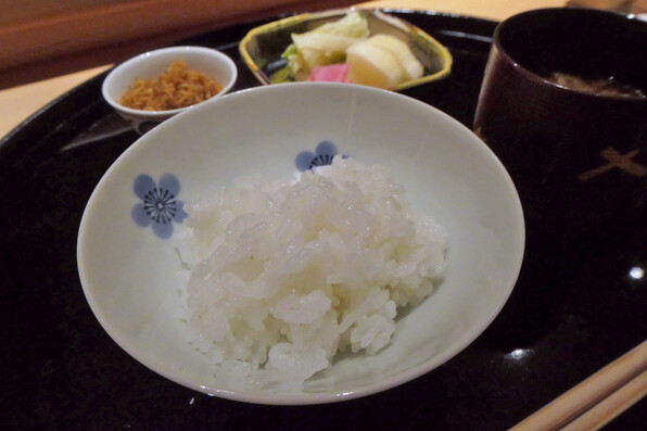 ●滋賀県のつやつやのコシヒカリでした。ものすごくこのご飯おいしかった(T_T)(T_T) 赤だし、香の物、ちりめん山椒と。