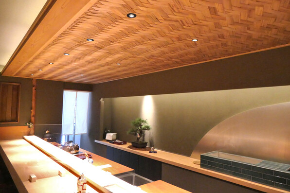 店内カウンターのお部屋は、受け継いだひのきの一枚板のカウンター(尾州のひのきで、長さは7m弱、厚さ14㎝)以外は改造というより完全に新しく造り変えられており、網代の天井、名栗の扉などなど、木の美しさに見惚れる思いでした。いるだけで気持ちよかったです(^o^)☆☆☆