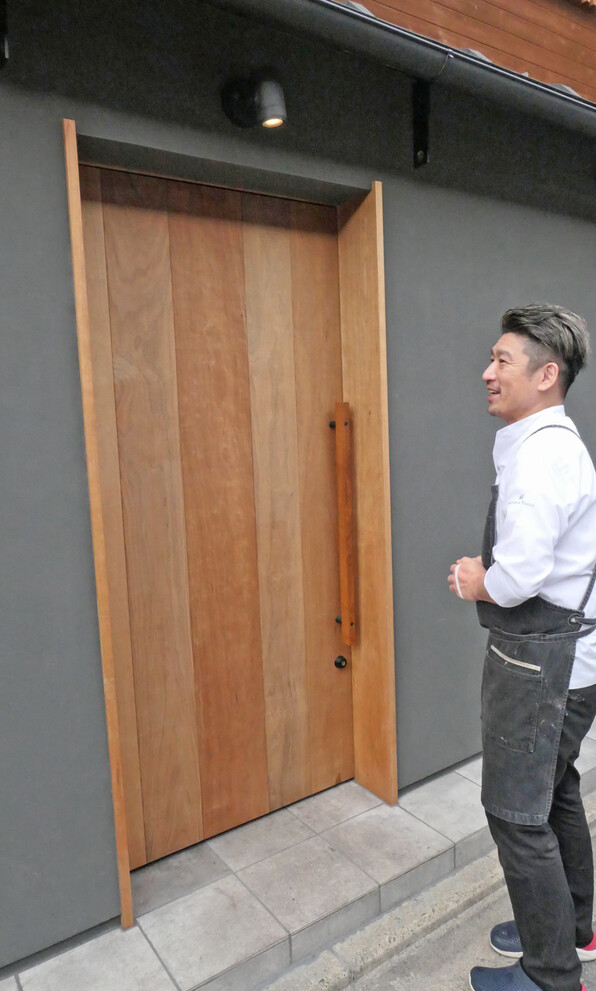 チェリーとウォールナットの無垢材を使った作られたドア、柔らかな質感で、なでさすりたいほどすてきです。さらに壁の色も独特でユニーク。