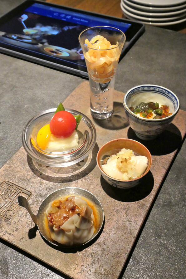 先付5品。いのしし焼売(甜醤ラー油で甘辛い)、蒸し鶏、くらげ、甘酢の白菜、トマト、金柑、生湯葉豆腐(上にさいの目にしたピータン)など。