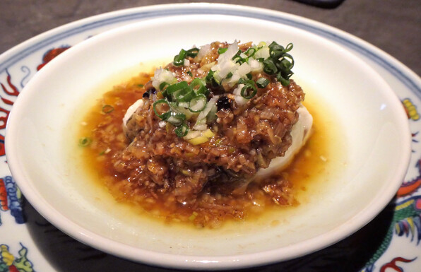 ●ひらめの蒸したのに、上のもろもろは大徳寺納豆、ねぎ、エシャロット。