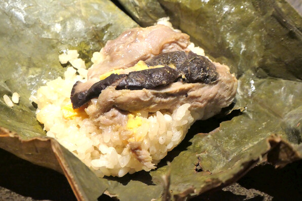 ●信州シャモのもも肉に、干し椎茸を合わせたおこわ。