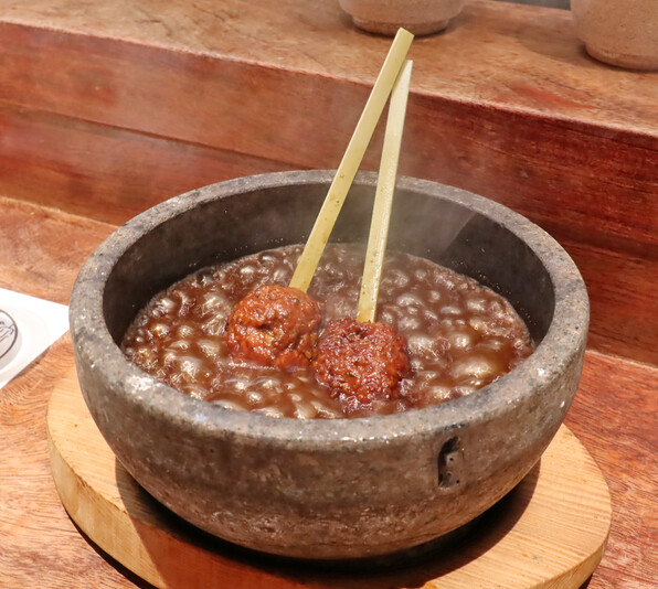 フォンドヴォーとバルサミコに浸って沸き沸きの熱々状態で供されます。
