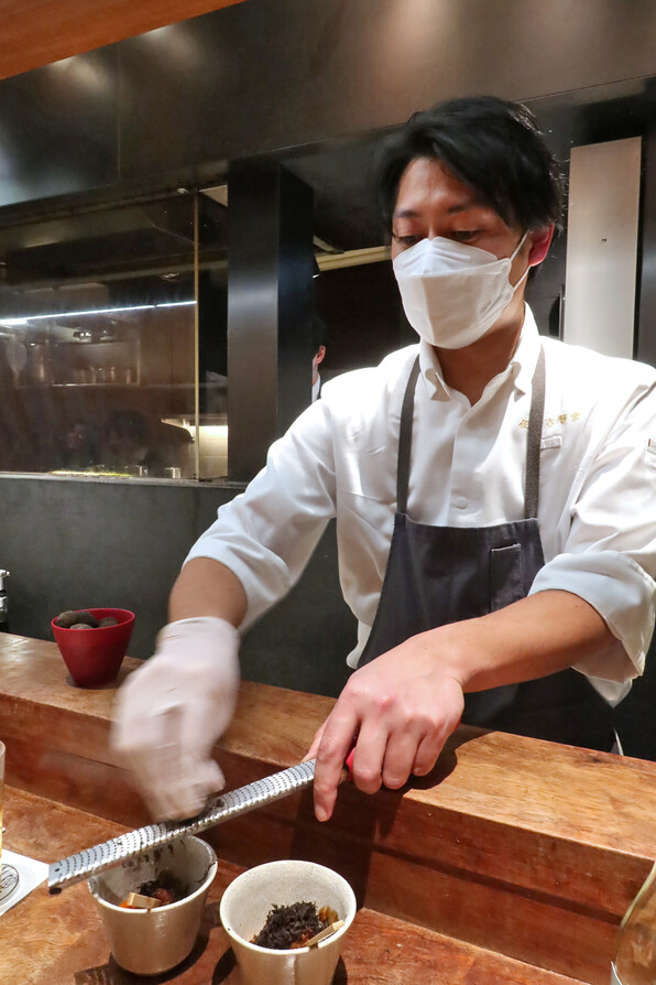 ●料理長・秋山達行さんが国産トリュフをわさわさと削ってくださって、