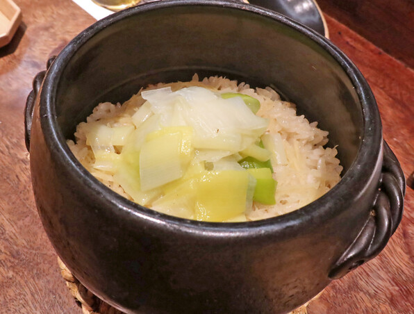 ●〆に土鍋ご飯。とろとろの葱、甘くてたまらん(T_T) 但馬の葱ということです。