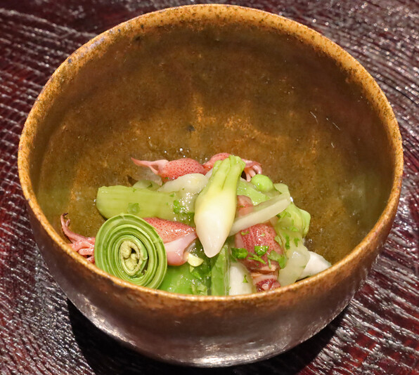 ●山菜の木の芽ジュレ和え。ほたるいか、うど、こごみ、たらの芽、スナップえんどう、うるい。
