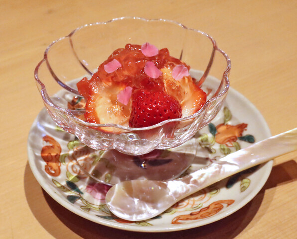 ●食後のデザートはいちごにいちごソルベ。シャンパーニュのジュレ。