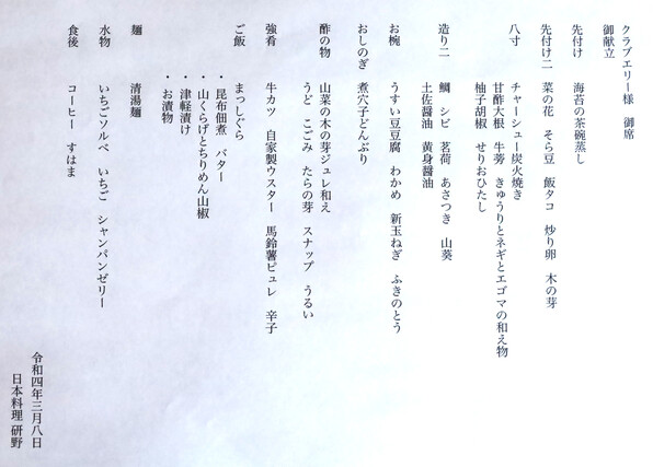 ■ 全国100万人の読者の皆さま、クラブエリー@「日本料理 研野」さん3月の報告でございます。