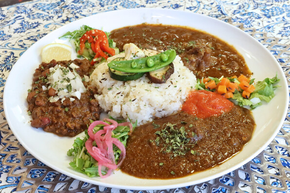 ●せっかくなのでお店にあったカレー3種類全盛りにしていただいて楽しみました。とろとろポークカレー、ヘルシーキーマカレー、近江牛すじカレー。香りよく奥行きのある味でした\(^o^)/\(^o^)/