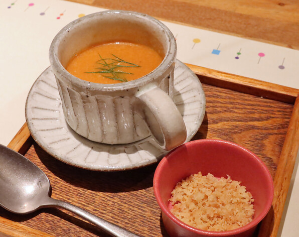 ●海老のビスクで始まりました。甲殻風味濃厚なスープです。旨いに決まっています。