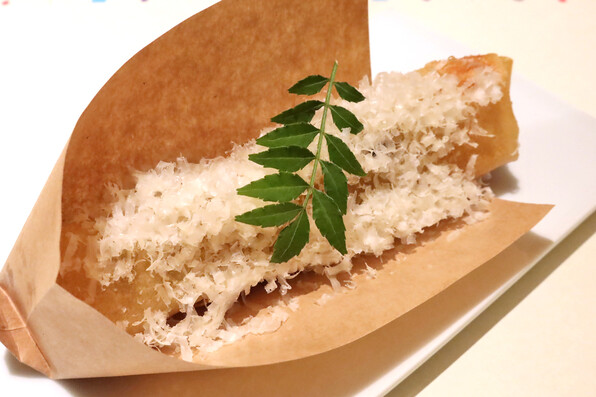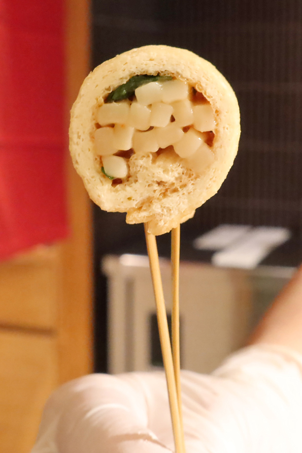 うどんと九条ねぎがお揚げに巻かれて揚げられていて、