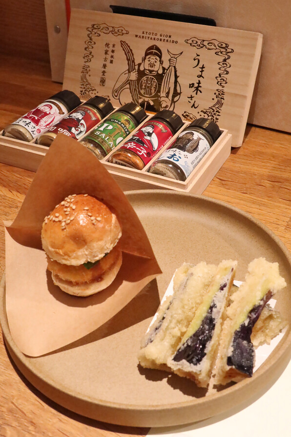 ●ミニバーガーと揚げ茄子。黒毛和牛のひき肉です。