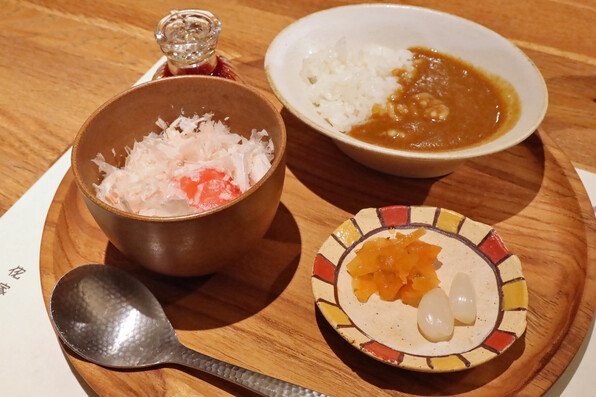 ●締めに、カレーと卵かけご飯\(^o^)/カレーにはらっきょと福神漬がたまらないアクセントで、卵かけご飯には極薄まぐろ節が風味を添えました。