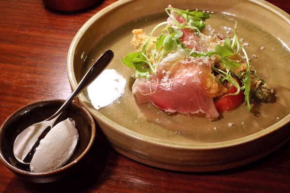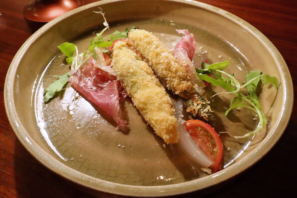 ●次に大きな緑アスパラガスのフライに生ハム(クラテッロ ディ ジベッロ\(^o^)/)ラヴィゴットソース、さらにシェーヴルのフロマージュ添えという仰天の旨さのお料理でした。