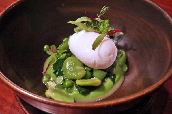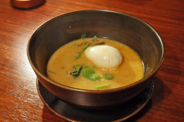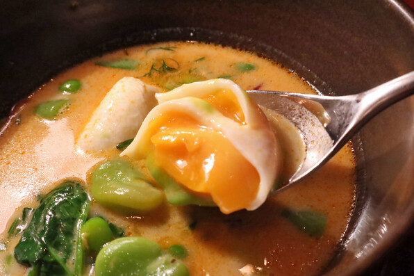 今回はボウルの底に、えんどう豆、そら豆、スナップえんどうなど豆類とバターソテにしたほうれん草、そしてポーチドエッグにレッドカレー。