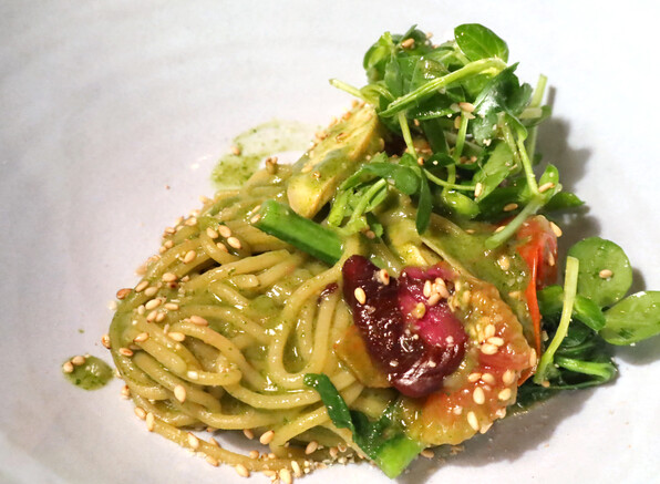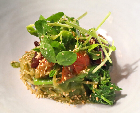 春メニュースタート後、心を奪われて訪れる度いただく大葉ジェノヴェーゼのパスタ、前回はミツカンさんのZENB麺で作っていただきましたが、今回は本来のリングイニで。同じメニュー名ながら、3月の初めは蕪やうるいが使われていて、前回は筍入り、今回は豆いっぱいで、刻々と季節を映す料理です。しば漬けのアクセントがすてき。上には豆苗でした。