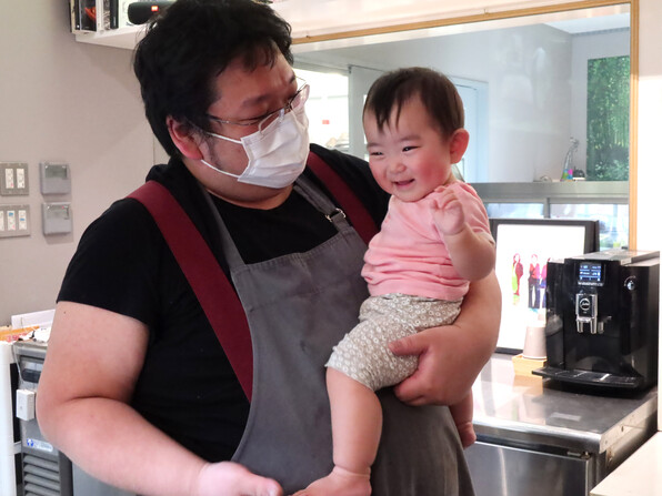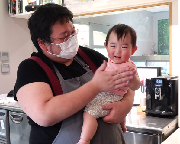 厨房でなんと、キンゾーさん=西原金蔵さんが孫のえまちゃんの子守をされているのがちらと見えたから、この写真撮りたくて出てきていただきました\(^o^)/で、左側はもちろん「ナンポルトクワ」店主でえまちゃんのパパ、西原裕勝さんです。
