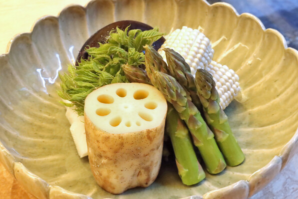 天ぷらは賀茂茄子やとうもろこしやこしあぶらの食感が感動的で、季節の味覚を喜びました。