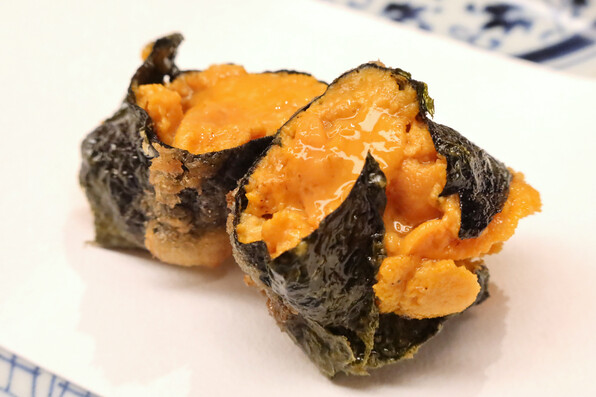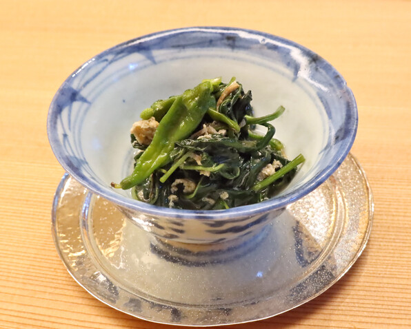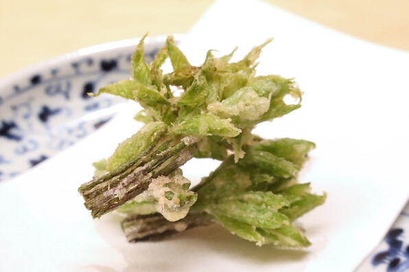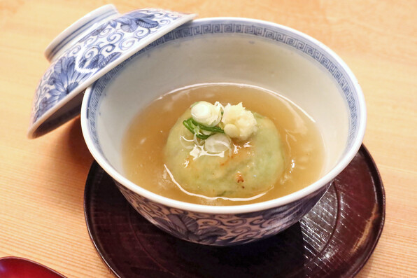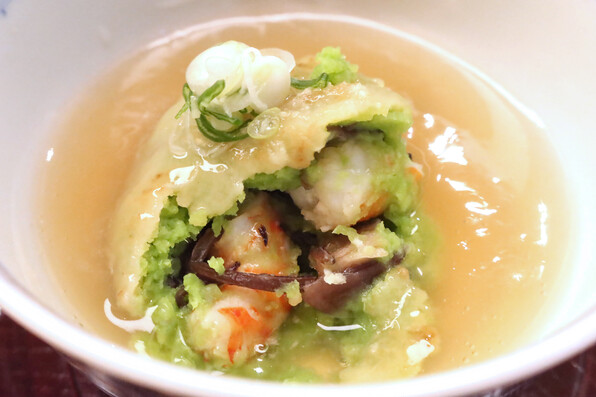 ●うすい豆蒸し物中に、海老、きくらげ、椎茸あられ揚げにしたうすい豆まんじゅう。あんは生姜の香り。