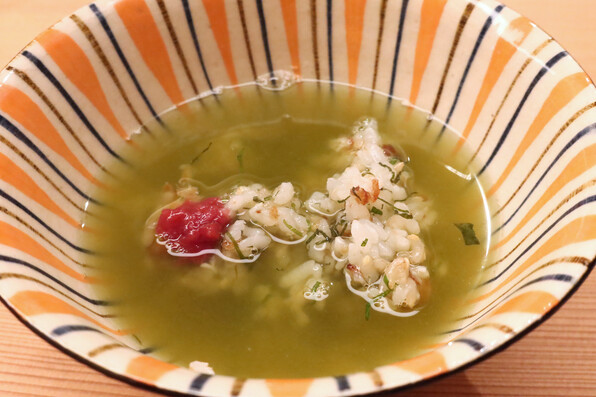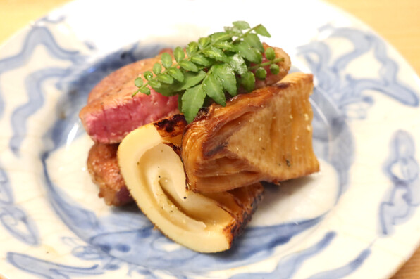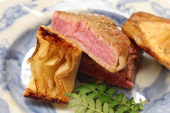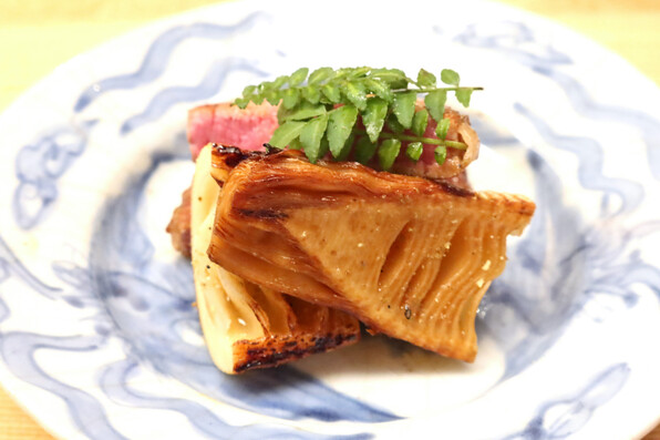 以下、あほみたいにおいしいおいしいとうわ言のように言いながらいただいたコースでしたが、とりわけ、おだしの香りのあんがかけられたうすいえんどう豆の饅頭(中に海老、きくらげ、椎茸)と、破竹と伊賀の牛フィレ肉に感じ入りました。