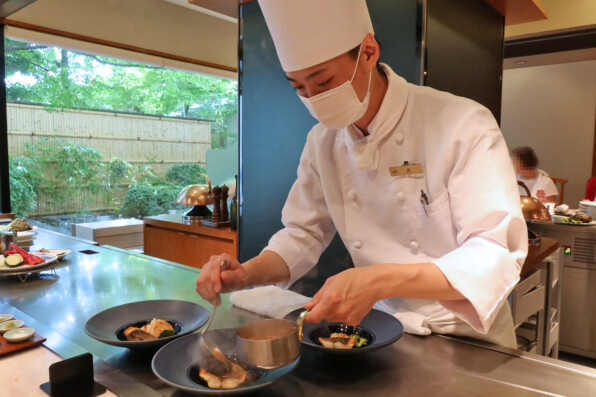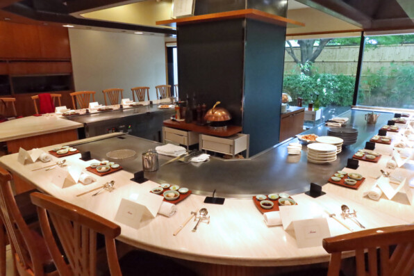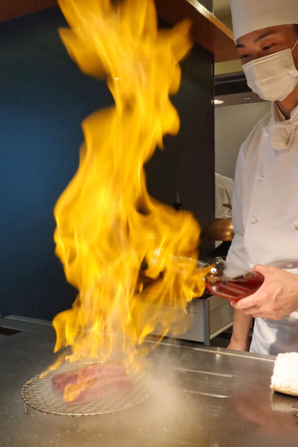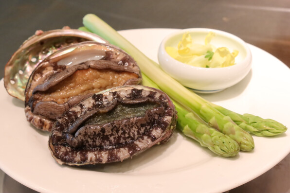 鉄板カウンターをぐるりと囲んで、活けあわびや牛フィレ肉などを楽しみました。