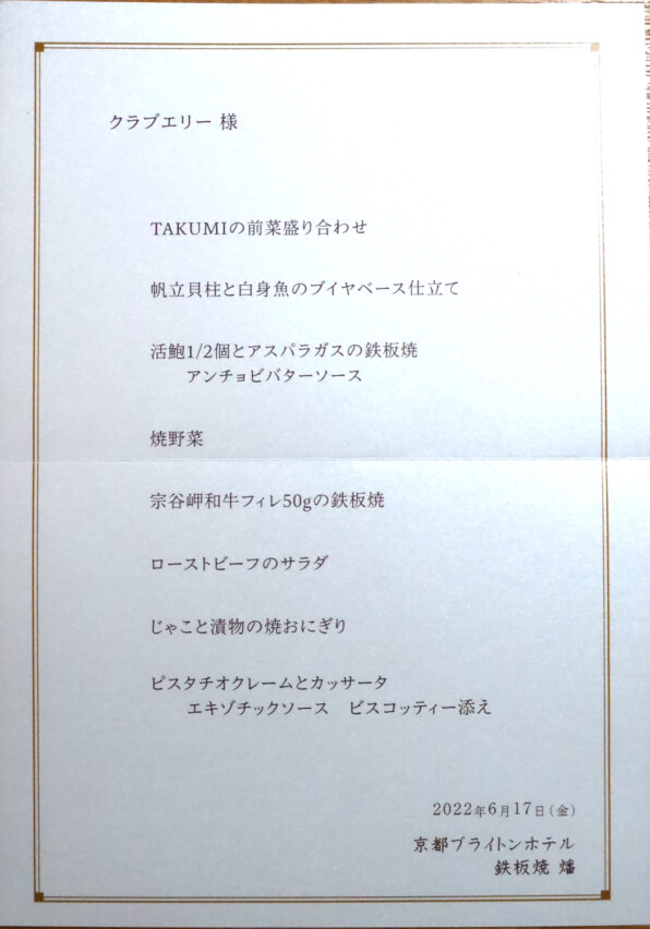 ●先月の6月17日(金)はクラブエリー第3金曜(という例会)で、「燔(ひもろぎ)」さん@京都ブライトンホテルへ。