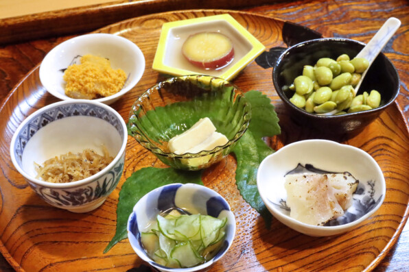 鳴門金時/枝豆/鯛の白味噌漬け/きゅうり酢とメロン/おじゃこ/烏賊からすみ和え/豆腐の金山寺味噌漬け