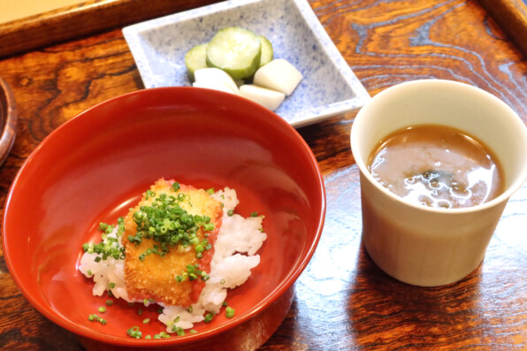 ●鱧かつをのせたご飯に、冷たい味噌汁、お漬物。
