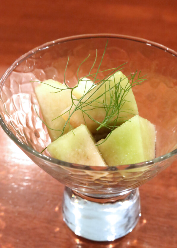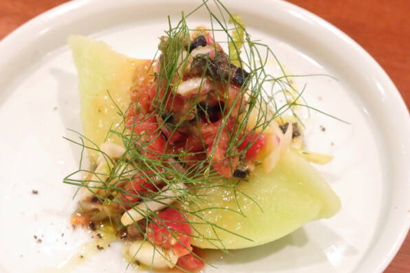 ●2皿目、津軽メロン、ういきょう、京トマト、オリーヴ、ういきょうの葉。