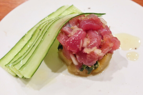 ●かつおのタルタルと焼き茄子(間ににら)、きゅうりスライス。