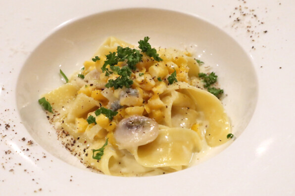 ●パッパルデッレ、ブルーチーズ(ゴルゴンゾーラとフルムダンベール)ととうもろこしのクリーミーソースで。