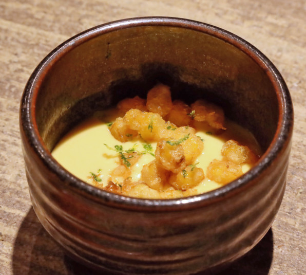 ●とうもろこしのスープ、パリパリに揚げたとうもろこし、振り柚子。