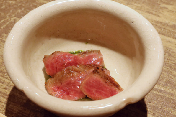 ●熊本の黒毛和牛、みすじ肉。下にズッキーニとバジルソース