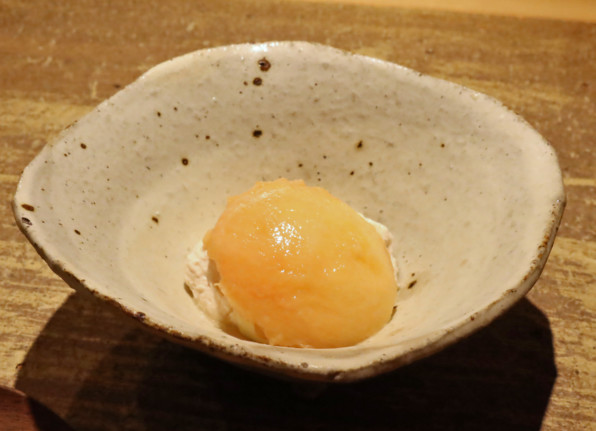 ●和三盆でマリネした白桃、下にホワイトチョコレートのソース。