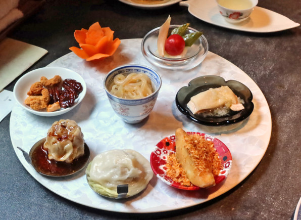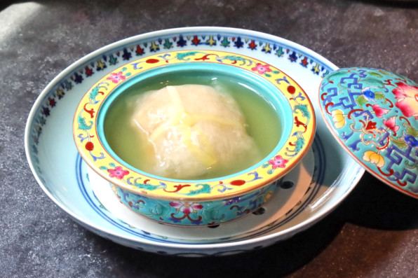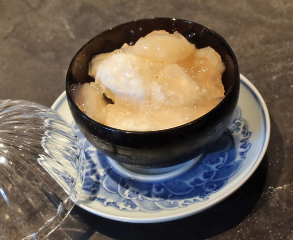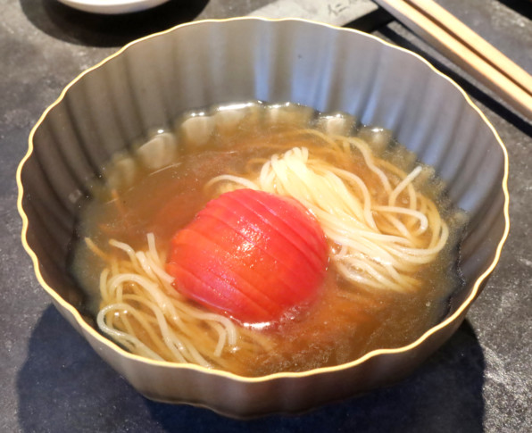 ●〆に冷麺。冷たい上湯スープが張ってあります。上にきれいに包丁を入れたトマト。