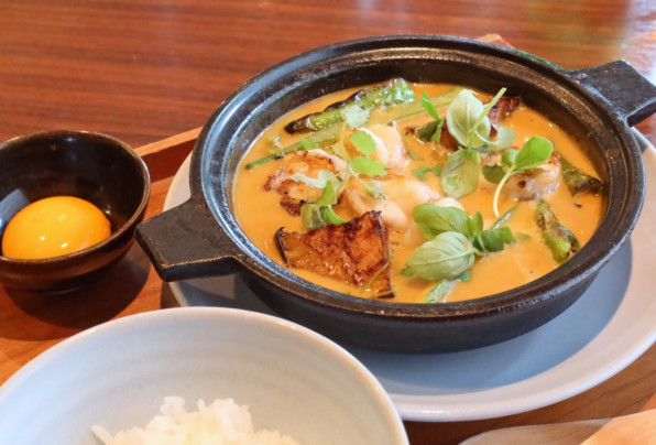 コース中で使われたレッドカレーソースに、海老や賀茂茄子を入れて、ハーブの香りも豊かな一品に仕立ててくださいました。