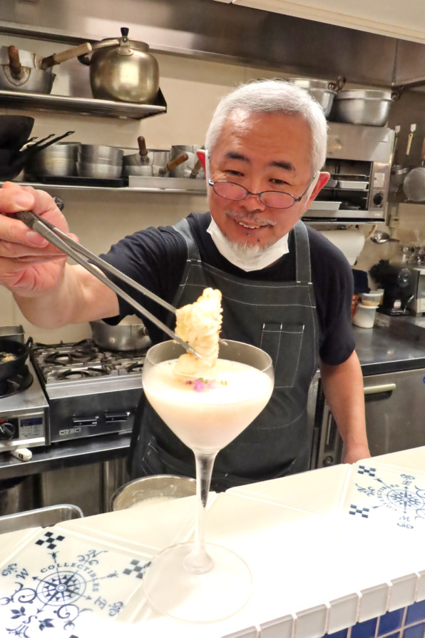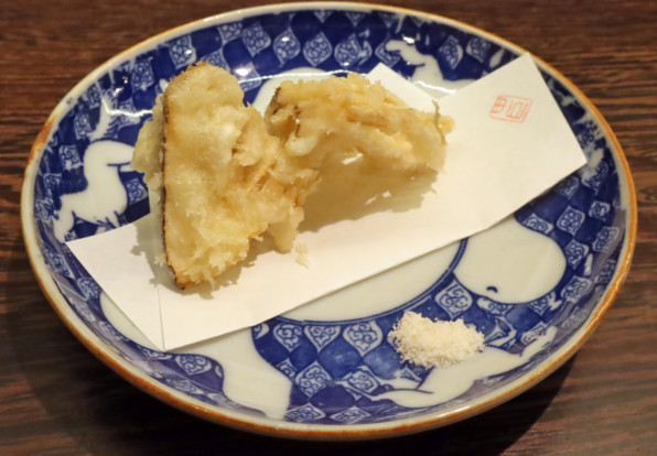 ●玉ねぎのスープ(冷製)に、揚げたての鱧の天ぷら
