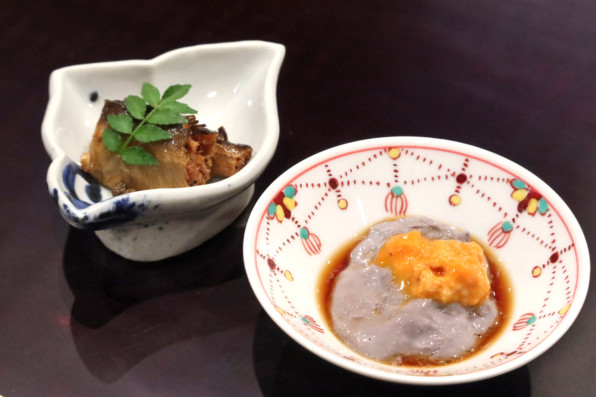 ●鮎の有馬煮に、黒豆湯葉と雲丹の先付で始まりました。