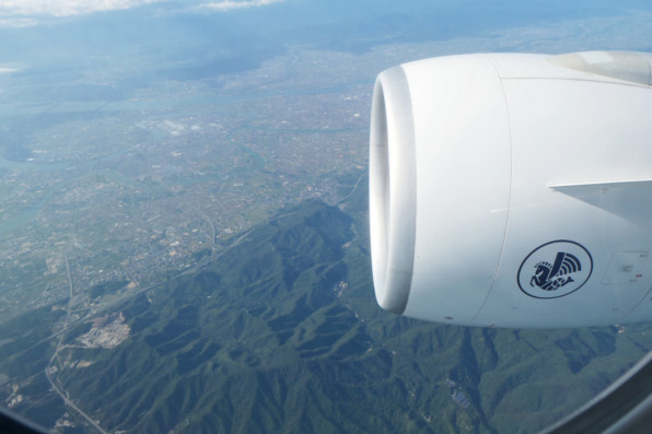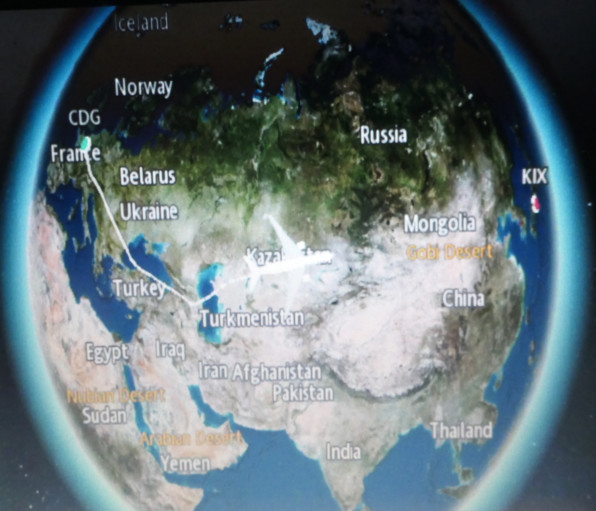 左側のCDGから右端KIXまで、黒海、カスピ海、ウズベキスタン、モンゴル、、という感じで、ロシアの上を飛べない分、ロシアの下側を飛んで来るわけです。12時間ならいつもの往路と同じで、少しも負担ではありませんでした。