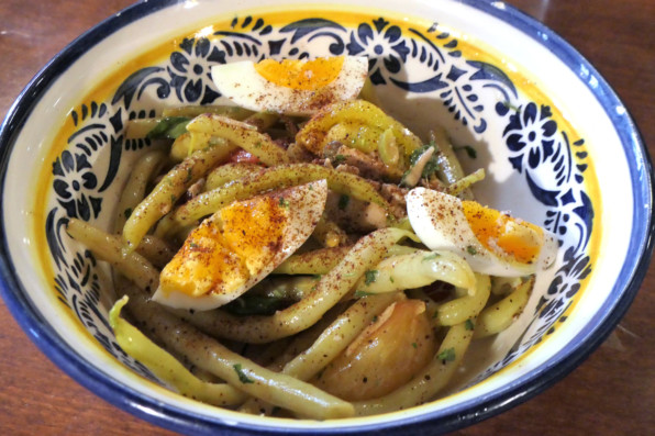 ●いんげんバターソテのサラダ(トマト、ツナ、茹でたまご入り)16ユーロと、