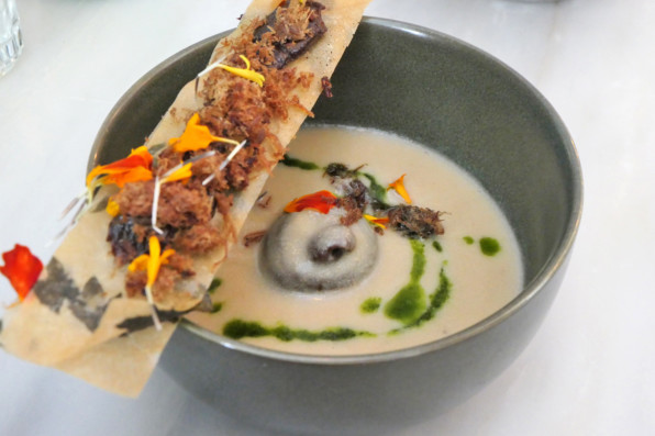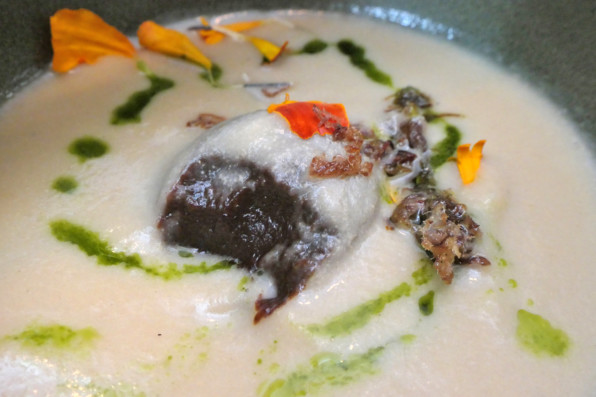 ●玉ねぎポタージュなのだけど、この真ん中に仕込まれた黒にんにくとプルーンのコンフィチュールが鮮やかな酸味を添えていてたまらん。